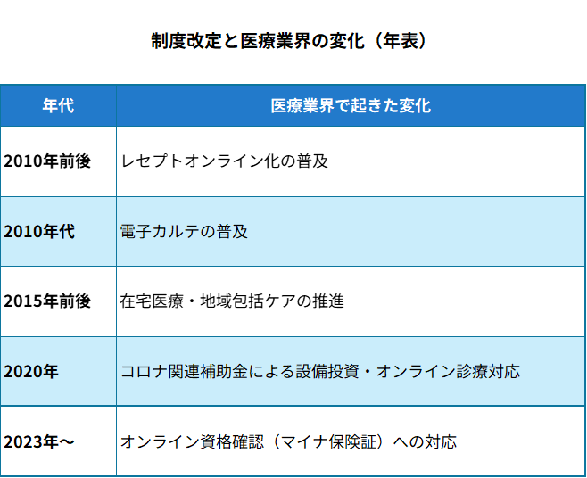 このときに起きていたのは、単なる制度対応というよりも、医療業界の中に新しい業務や設備、仕組みが一斉に必要とされるようになった、という変化だったと言えるかもしれません。