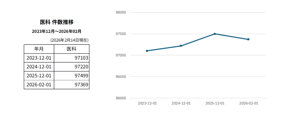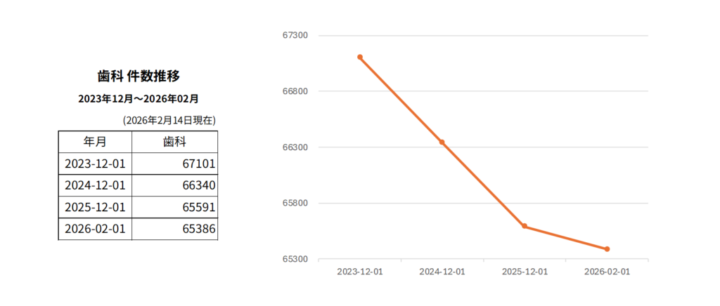 2023年末から直近(2026年2月)までの推移を整理すると、医科は横ばい、歯科は減少という対照的な動きが見えてきます。