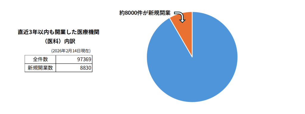 しかし、ここで開業日に目を向けてみます。直近3年以内に開業した医療機関は、2026年2月時点で8,830件。全体の約9%を占めています。